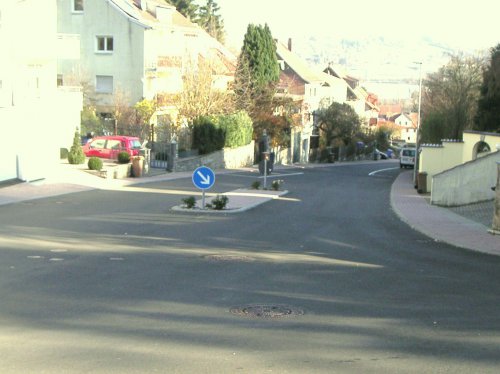 Da gibt es vor der Einmündung zur Lehmgrubenstraße eine Insel in der Mitte der Straße. Gleichzeitig sind die Gehsteige auf beiden Seiten so schmal, dass zwei Schüler oder Erwachsene nicht nebeneinander laufen können. Auch ein Rollstuhlfahrer wird gezwungen sein, auf die Straße auszuweichen. Es gibt Stimmen, dass diese Breite nicht zulässig wäre. Da ist sicher mit Einsprüchen zu rechnen. Auch wird durch die Verengung ein Autofahrer gezwungen hinter einem Fahrradfahrer, der bergauffährt oder einem selbstfahrenden Rollstuhlfahrer hinterherzufahren oder es entstehen gefährliche Situationen beim Überholen.