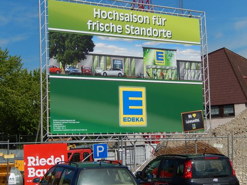 Das einzige, was die Bürger bewundern können, ist das Bild, das Edeka aufgestellt hat.Obwohl Edeka ja bekanntlich alle Bäume gefällt hat, erweckt sie jetzt wieder einen zum Leben. Warum? weil der Bürger nicht sehen soll, dass der Aufzug nicht verwirklicht wird!